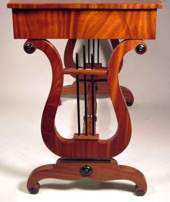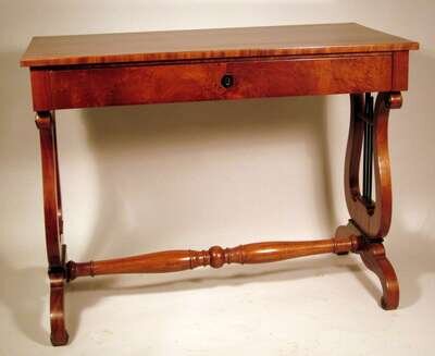 The rectangular top over a long frieze drawer raised on two lyre end supports joined by a turned stretcher.