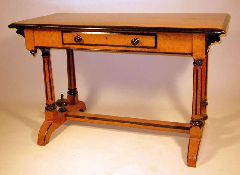 The rectangular top with ebonized molded edge over single frieze drawer, on fluted columns supports joined by a flat stretcher, raised on trestle feet.