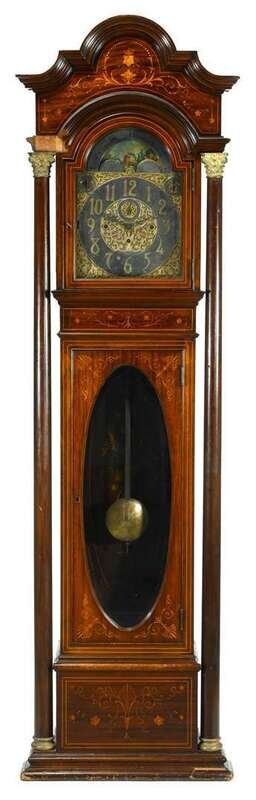 The molded arched hood with scrolling inlay above a silvered and brass Arabic numberal dial with subsidiary seconds dial, a Silent/Strike dial, and a calendar moon phase dial, with Westminster chimes over long beveled glass door raised flanked by tall Corinthian columns with gilt metal capitals, on a molded base.