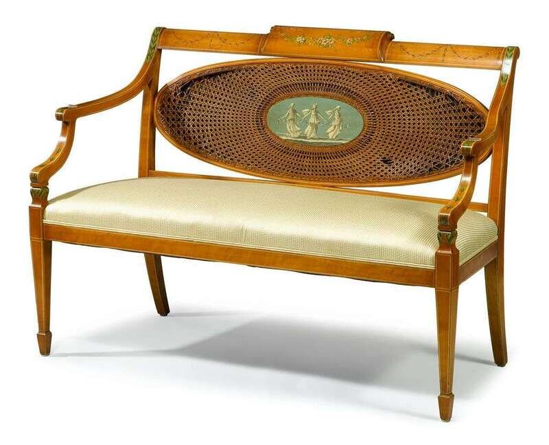 The back rail painted with flower garlands over a caned oval panel centered by a painted reserve of classical women, raised on square tapering legs ending on spade feet.