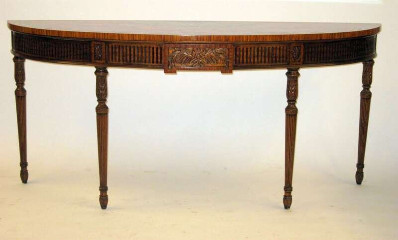 The shallow D-shape top with a painted half fan medallion framed by floral garlands, over a conforming fluted frieze centered by a wheat carved panel, raised on foliate carved and fluted tapering legs.