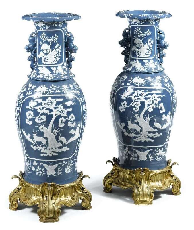 Baluster form with foliate carved rims and applied molded Fu lions to the necks, applied with white foliate sprigs enclosing reserved depicting deer and herons beneath pine trees, and against a blue ground, mounted on Rococo style cast gilt metal stands.(2).