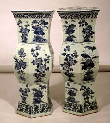 Waisted form decorated with underglaze blue prunus, chrysanthemums, peonies and lotus.(2).
