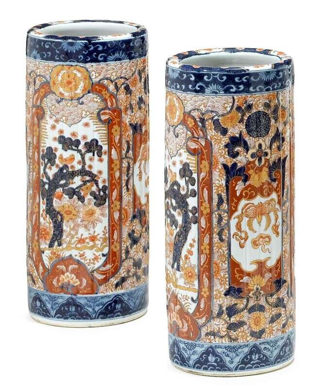 Tall lobed cylindrical form, underglazed in typical palette.(2).