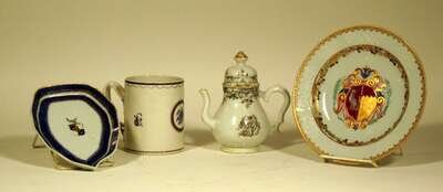 Comprising a small pear-shaped coffeepot, an armorial leaf-shaped dish with the Dudley coat-of-arms, an armorial plate, and a tankard with a twist handle.(4).