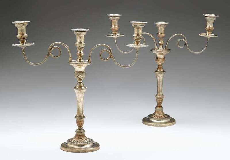 With two scrolling and one stiff candle arm with urn form candle nozzles with drip pan inserts, on an urn and baluster stem ending on a circular foot.(2).