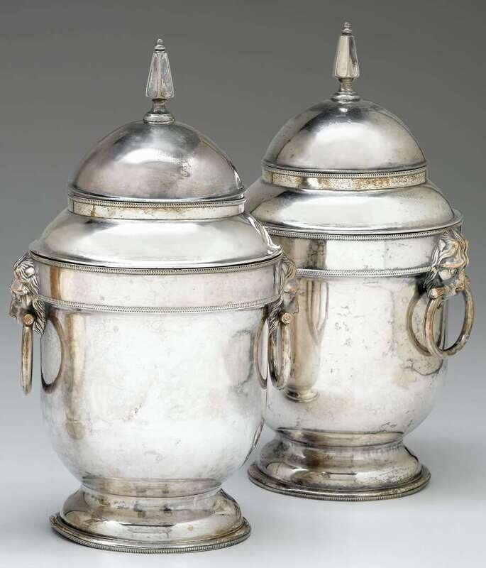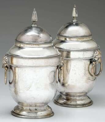 Each with a domed cover and faceted spike finial above a ring turned body with lion mask loop handles, on a circular foot.(2).