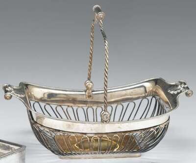 The shaped recangular basket with a twisted handle and open looped wire sides and opposing shell cast scroll handles, maker's stamp 'R'.