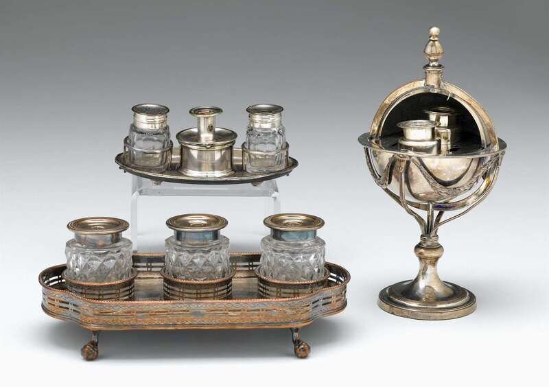 The first in the form of a globe on stand hung with laurel garlands, opening to reveal an ink and sandpot; the second of shaped oval form with a pierced gallery raised on ball and claw feet, with three pressed glass inkpots; and a small oval tray fitted with a taper holder and glass ink and sandpots.(3).