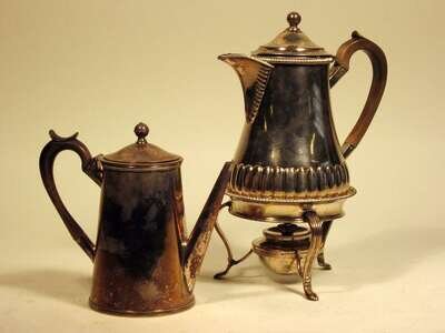 The first a coffee biggin of pyriform with a part-lobed body and scroll treen handle, on a tripod frame with burner; the other a tapered cylinder teapot with a scroll treen handled and ball finial.(2).