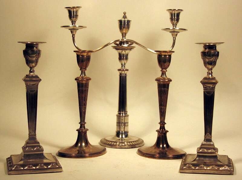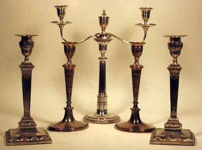Comprising a pair of square tapered sticks with urn holders and square bases; a pair of tapered faceted sticks with flattened urn holders and oval bases; and a convertible candelabrum with two scrolled candle arms and central urn finial.(3).