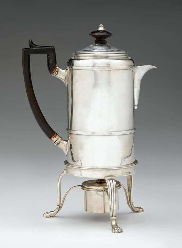 The cylindrical pot with an angled treen loop handle and treen knop, on a tripod stand with burner, ending on paw feet.