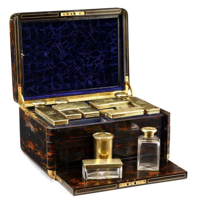 The calamander case with a hinged cover centered by a monogramed plaque, the interior with two swing out shelves fitted with ten glass boxes with silver gilt covers, four bottles with silver gilt caps, and a silver gilt cylindrical jar, all with monogram 'DEC'; the fall front concealing a drawer, the lock plate with patent number and makers stamp.