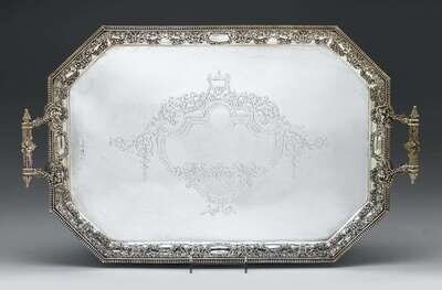 The rectagular tray with canted corners and a wide border of floral swags and grotesque masks, with grape and vine cast handles, centrally engraved with a vacant cartouche.