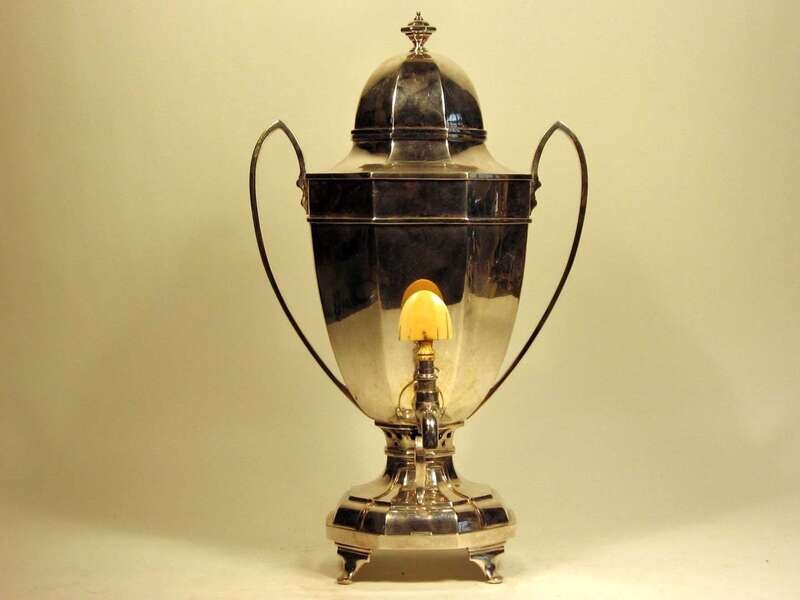 With a faceted domed lid and body with high loop handles and ivory spout knob, on a domed foot raised on splayed feet.