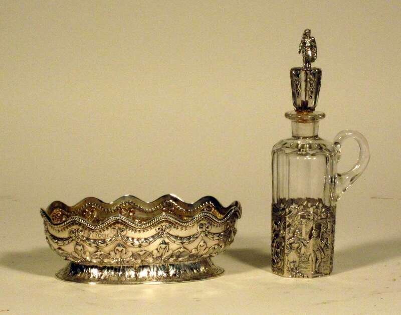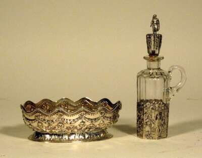Comprising a Victorian Charles Stuart Harris sterling silver sweet meat dish, London, 1885; and a German silver and glass condiment bottle with a figural stopper.(2).