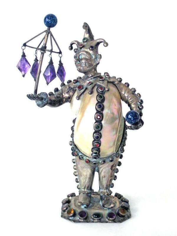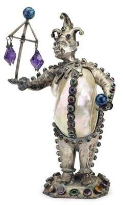 German silver, turbo-shell and 'jewel' mounted jester figure simon rosenau, early 20th century