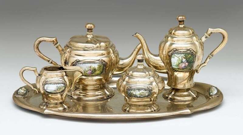 Comprising a coffeepot, teapot, covered sugar bowl, cream jug and serving tray; each of lobed form mounted with enameled panels depicting 18th century courting scenes.(5).