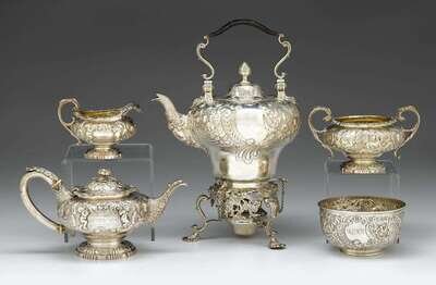 Assembled English sterling silver five piece tea service joseph craddock & william ker reid, london, 1818 & later