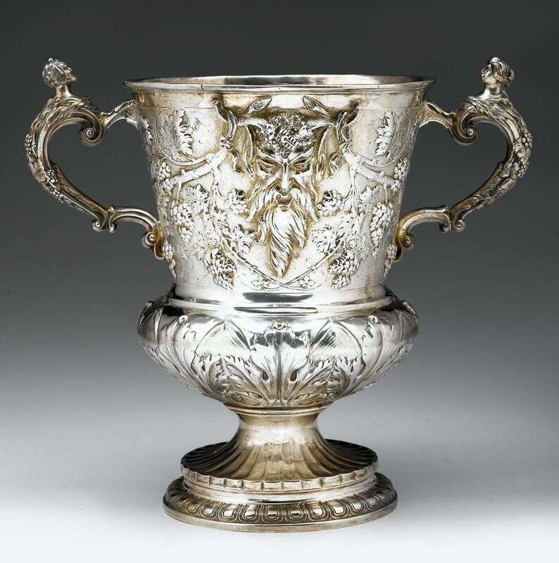 Urn form, the body embossed with grapevines and Bacchic masks and flanked by scroll handles with Bacchic head finials, on a circular foot, with French import marks.