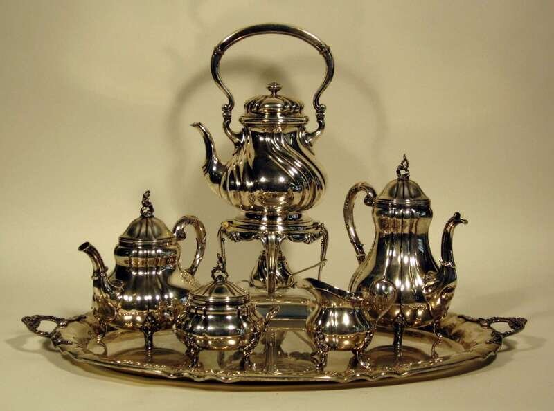 Comprising a coffeepot, teapot, creamer, covered sugar bowl and tray, the pots of lobed pyriform with openwork scroll finials, raised on foliate scroll feet, all stamped 830 with city mark; and a later hot water kettle and burner, stamped 835 and retailer's stamp Juluis Herz.(6).