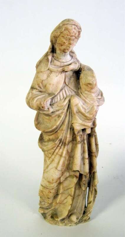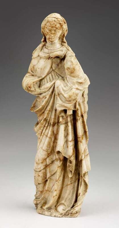The heavily draped, robed figure standing with her head tilted slightly to the left and her right knee bent, holding the Christ child in her left arm.