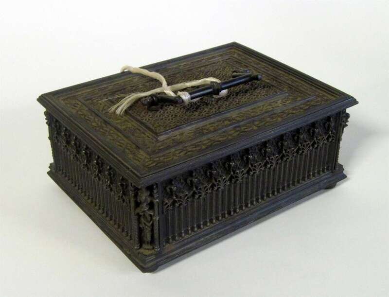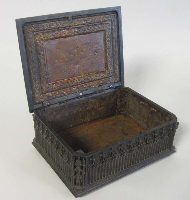 The rectangular hinged lid with foliate bands, the sides with relief cast Gothic arches and marked at the corners with standing male figures, on flattened bun feet.