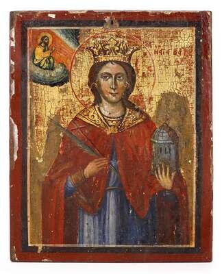 The saint depicted wearing a crown and holding a quill in his right hand and a model of a church in his left, the seated figure of Christ on a cloud in the upper left, on wood panel.
