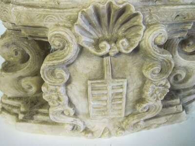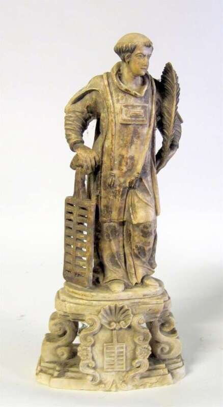 In two parts; the figure shown standing wearing a dalmatic and holding a gridiron in his right hand and a palm leaf in his left, raised on a scroll carved pedestal centered by a cartouche.
