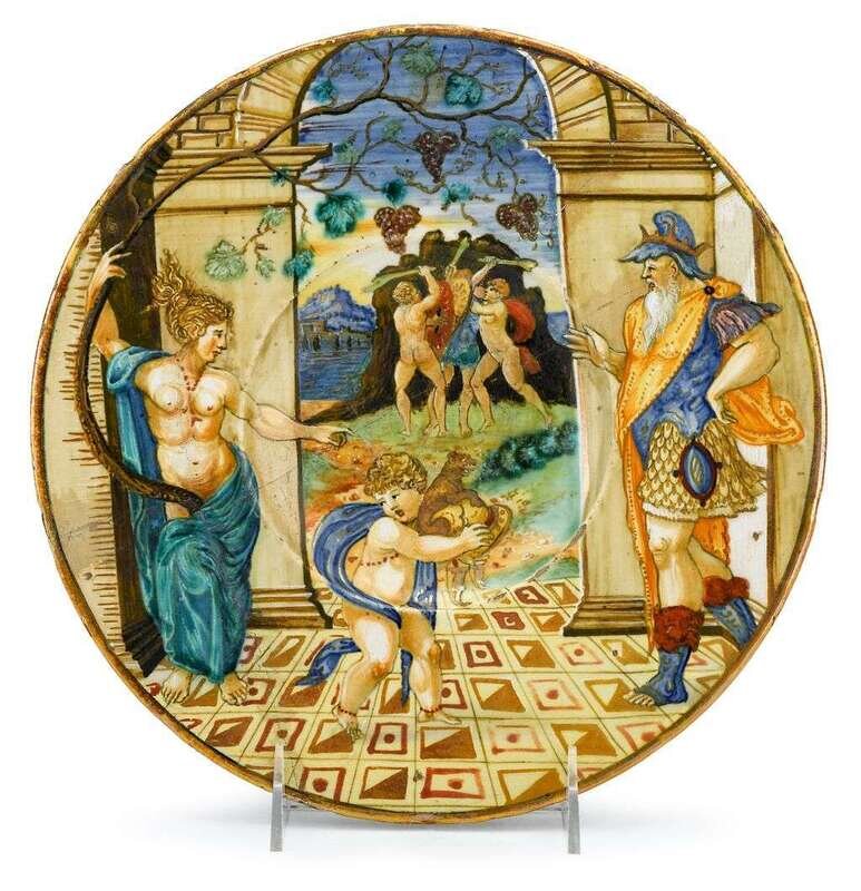 Italian maiolica istoriato dish urbino, mid 16th century
