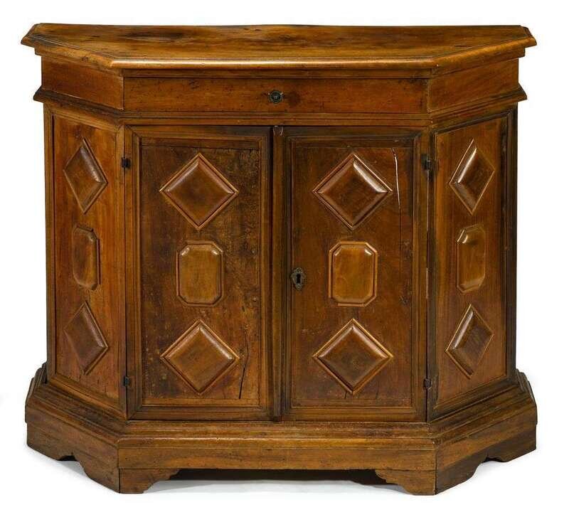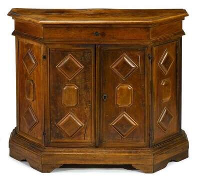 The angled D-shape top over a single frieze drawer and a pair of paneled doors with applied molded bosses, on a conforming plith base raised on short bracket feet.