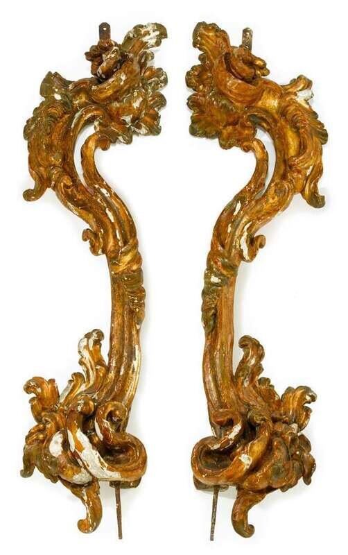 Long S-scrolls carved and gessoed with exuberant foliate scrolls.(2).