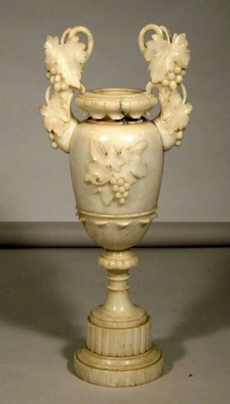 Two handle urn with carved foliate sprigs, raised on a turned column and fluted base.