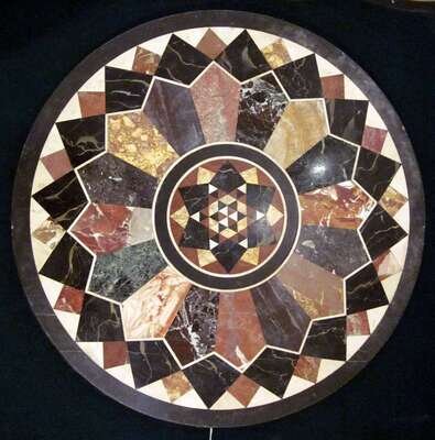 Circular, inset with various radiating arrow-form hardstone sections framing a central medallion.