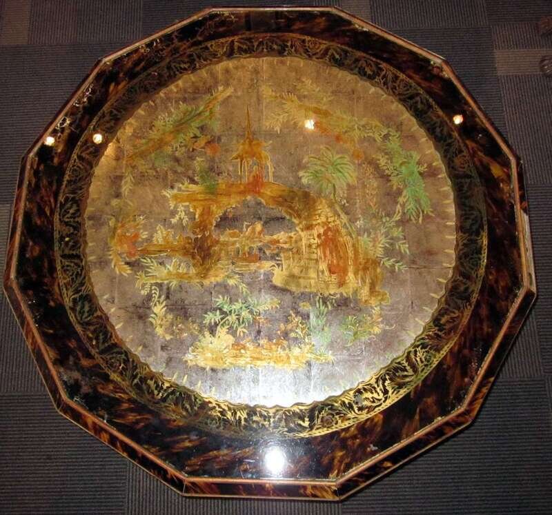 Continental simulated tortoiseshell inlaid, eglomise and carved center table
