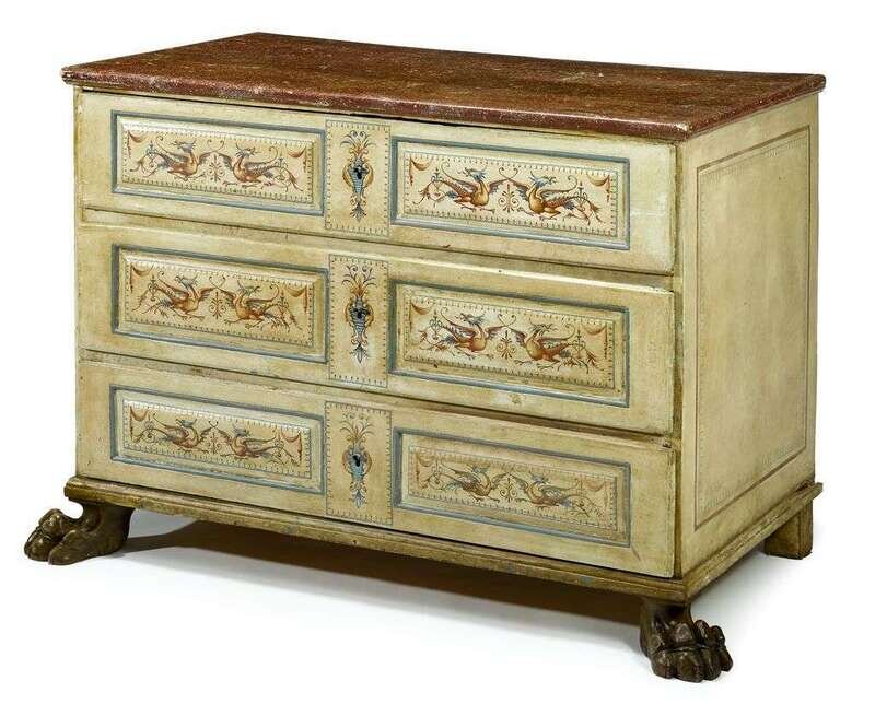 The painted faux rouge marble molded rectangular top over three long drawers painted with grotesques and arabesques and pale blue borders, raised on large carved paw forefeet.