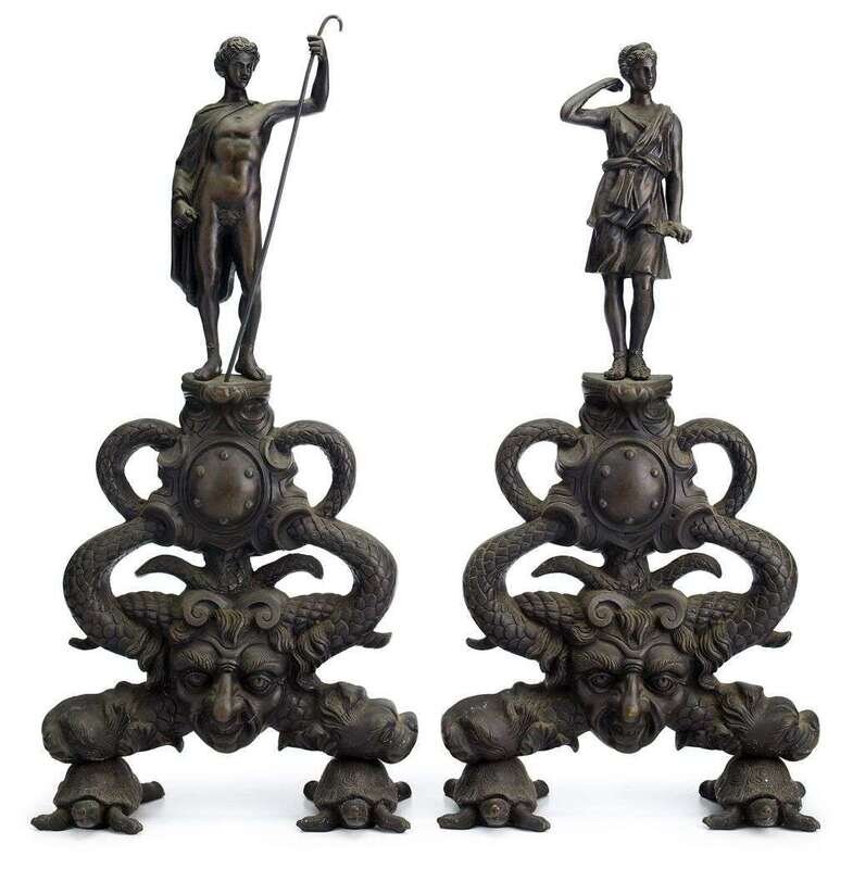 Dark brown patina, surmounted by figures of Apollo and Diana, raised on scrolling dolphins centered by a grotesque mask, terminating on tortoise feet.(2).
