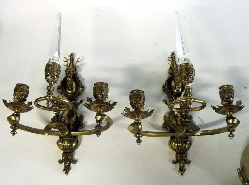 Each with a shaped backplate mounted with a stag head and griffin, issuing two scrolling candlearms and a faceted glass finial. (2).