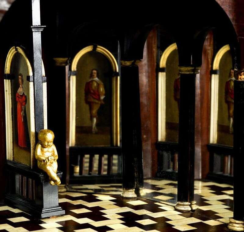 Two parts, the top with an ebonized ripple molded cornice, over three long frieze drawers, above a central arched landscape painted door opening to reveal a mirrored recess with a gilt bronze putto and Baroque style miniature portraits over an ebony and bone checkered floor; all flanked by two gilt metal busts and drawers; on a later ebonized cabinet with grille doors raised on bun feet.