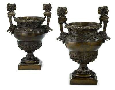 Brown patina, the foliate cast rims over a foliate cast neck and shoulder, the handles with double head finials and boars' head bases, raised on a foliate cast foot and square base.(2).