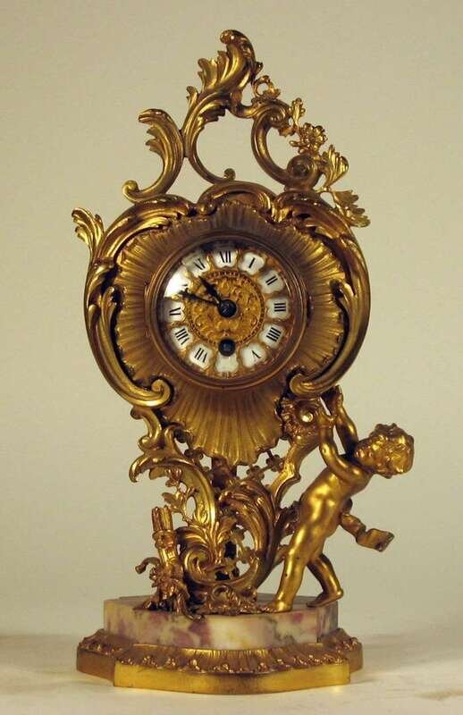 The open foliate and C-scroll cresting over circular dial set with white enamel Roman numeral, supported by a putto and further foliate scrolls, mounted on a shaped marble base.