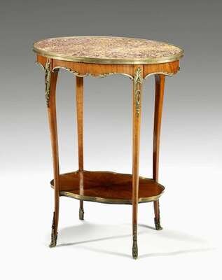 The oval breche d'Alep marble top over a shaped frieze with edge mounts, raised on slender cabriole legs united by a shaped undertier.