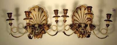 The carved scalloped shell backplate issuing three scrolling candlearms.(2).