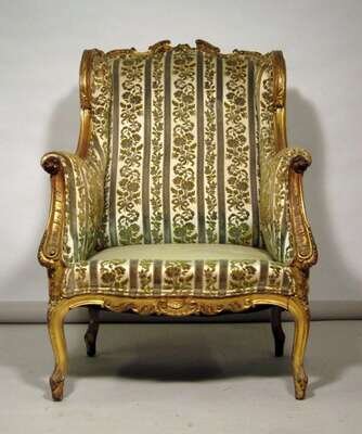 The white painted floral and scroll carved frame enclosing a padded straight back and pronounced ears, leading to padded enclosed arms, raised on short cabriole legs ending in scrolled toes.
