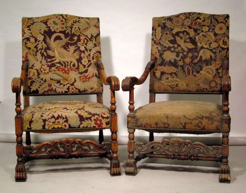 Each with a needlework upholstered and shaped back issuing two scrolling and foliate carved arms, over a conforming seat, terminating on carved stylized paw feet. (2).