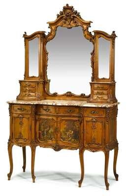In two parts: the superstructure with a central shaped mirror enclosed in a shell carved frame with a double scroll pediment, flanked by smaller mirrors over shelves; the base with a shaped Breche marble top above three short frieze drawers and a pair of Vernis Martin doors flanked by plain carved doors, raised on cabriole legs ending in scrolled toes.