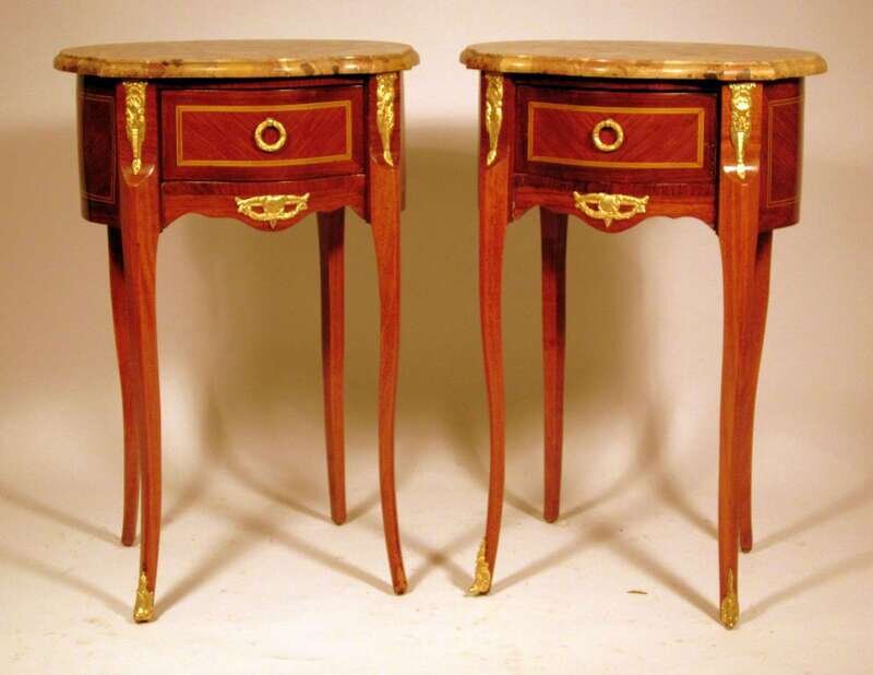 Each with a shaped oval Breche d'Alep marble top above a single drawer, raised on slender hipped cabriole legs mounted with chutes and ending in sabots. (2).