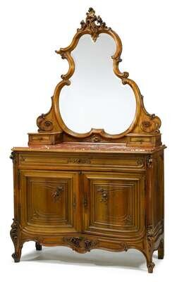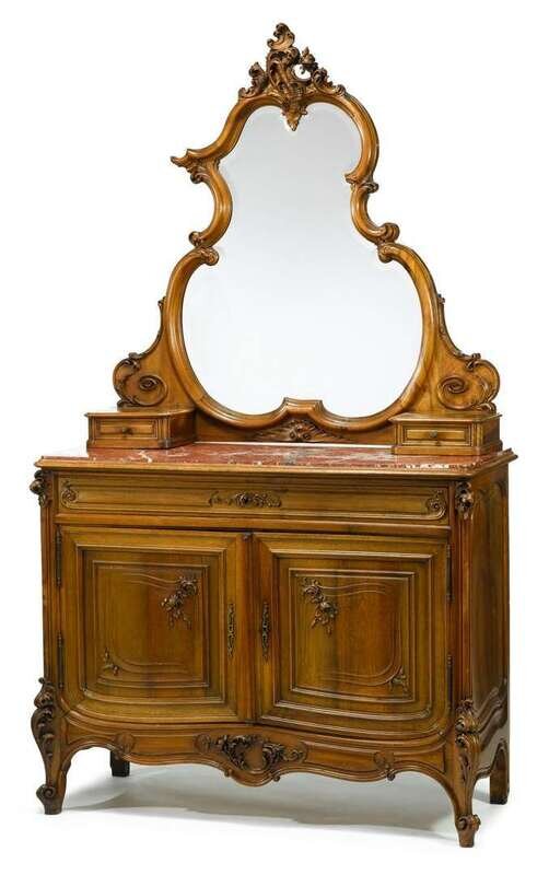 The superstructure with a shaped mirror plate enclosed in a carved C-scroll frame, above two small drawers; over a rouge marble inset top, above a long friezed drawer and a pair of molded cupboard doors, over a carved apron and raised on short cabriole legs with scrolled toes.