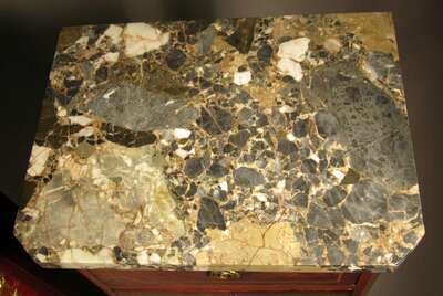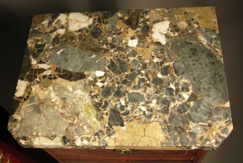 Each with rectangular Breche marble top with canted forecorners over gilt bronze chutes and seven narrow inlaid drawers, raised on short cabriole legs with gilt bronze shoes. (2).