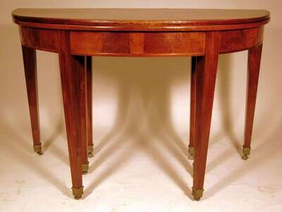 The D-shaped folding top over a plain frieze, with three leaf extensions, raised on tapered square legs with brass sabots and castors.